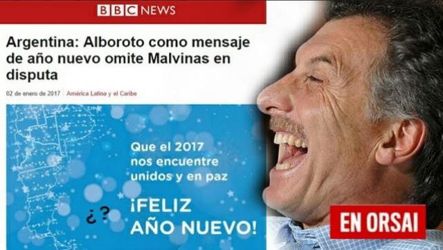 Los ex combatientes y los usuarios de medios sociales dijeron que el mensaje era ofensivo para aquellos que murieron en la guerra de 1982. El ministerio ha pedido disculpas, diciendo que era un error por el equipo de diseño.Las islas son un territorio británico en el Atlántico por la Argentina, donde se les conoce como las Islas Malvinas.El presidente Mauricio Macri, quien asumió el cargo en diciembre de 2015, prometió un "nuevo tipo de relación" con el Reino Unido, una medida vista como destinada a impulsar la alicaída economía de Argentina.Desde entonces, los países han acordado trabajar hacia la eliminación de las medidas restrictivas de la industria del petróleo y el gas, el transporte y la pesca alrededor de las islas. Pero la cuestión de la soberanía no se ha discutido.Twittear desde el ministerio de desarrollo social de Argentina dice: "Nuestras disculpas por el error del departamento de gráficos en el mensaje del nuevo año"Pie de foto El ministerio dijo en Twitter: "Nuestras disculpas por el error del departamento de gráficos en el mensaje del nuevo año"Saúl Pérez, que luchó en la guerra, ha mostrado su "malestar", y dijo a canal de noticias C5N que "no fue un error".Dijo que la omisión fue parte de una campaña del gobierno de Macri a "establecer una prioridad para el comercio bilateral" sobre el reclamo de soberanía.Alicia Castro, quien se desempeñó como embajador de Argentina en el Reino Unido durante el gobierno de Cristina Fernández de Kirchner, llamada la ausencia de las islas "inadmisible"."Estoy molesto para ver este mapa mutilada. Por lo general, los británicos hacer esto, no he visto ningún gobierno haciéndolo", dijo a Radio 10 de Argentina, de acuerdo con el diario La Nación (en español).Algunos usuarios en las redes sociales acusaron al gobierno de traición a la reclamación de soberanía.